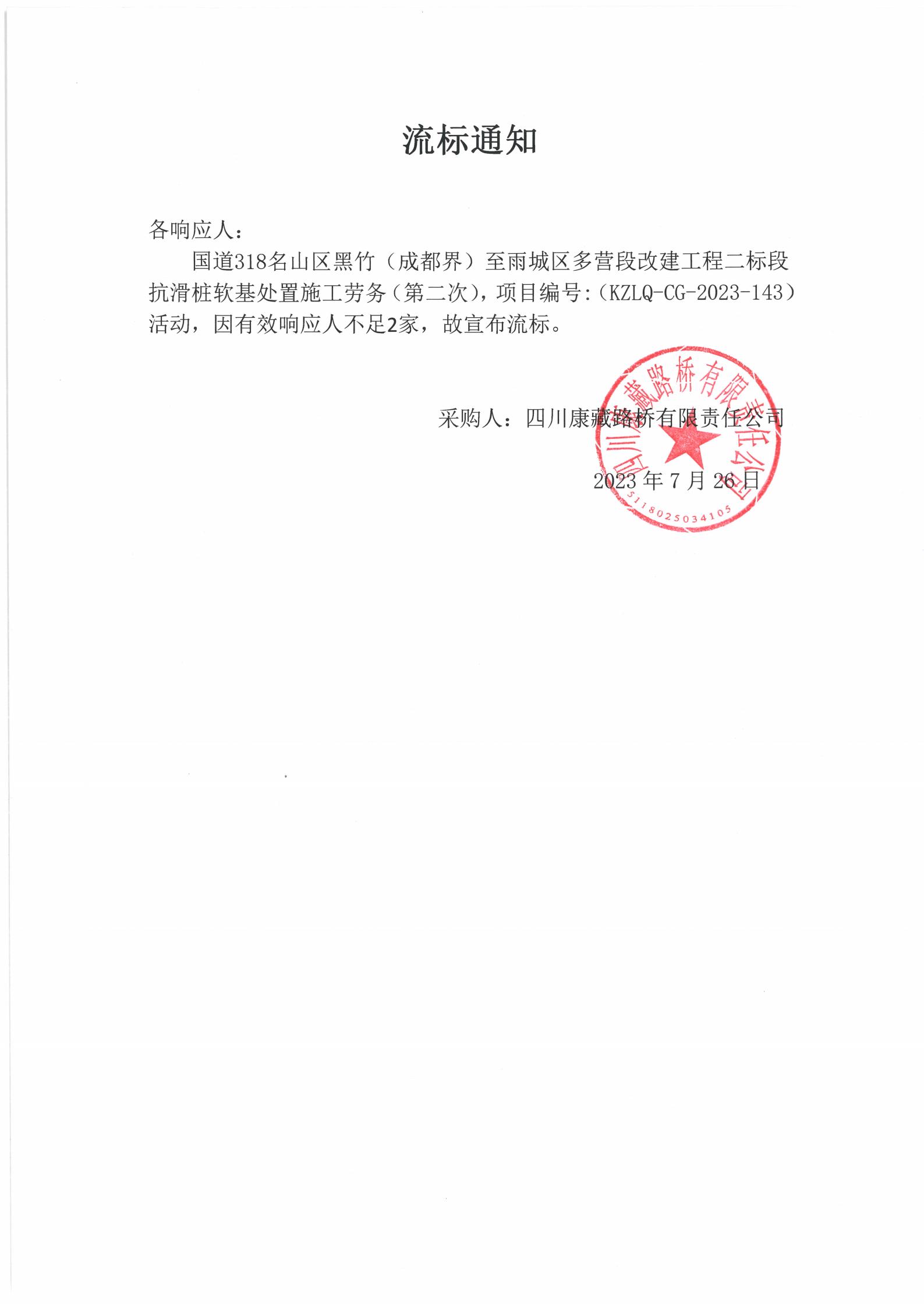 四川康藏路橋有限責任公司國道318名山區(qū)黑竹(成都界)至雨城區(qū)多營段改建工程二標段抗滑樁軟基處置施工勞務(第二次)流標通知