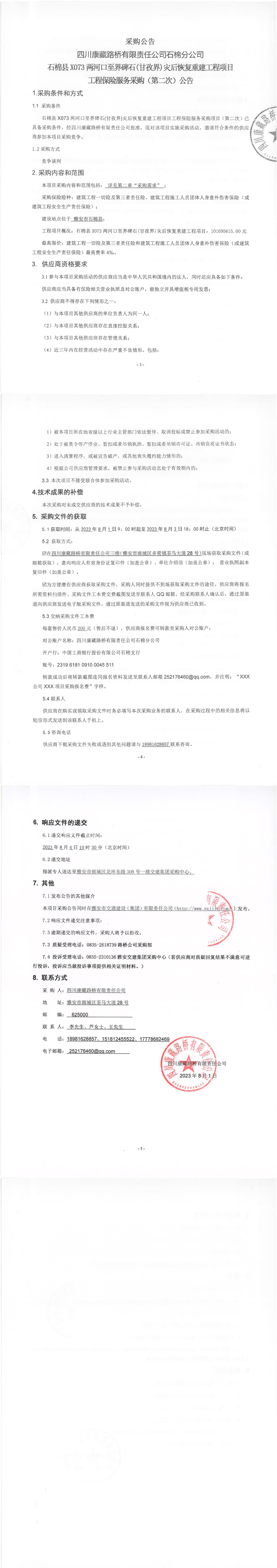 四川康藏路橋有限責任公司石棉分公司石棉縣X073兩河口至界碑石(甘孜界)災后恢復重建工程項目工程保險服務(wù)采購(第二次)公告