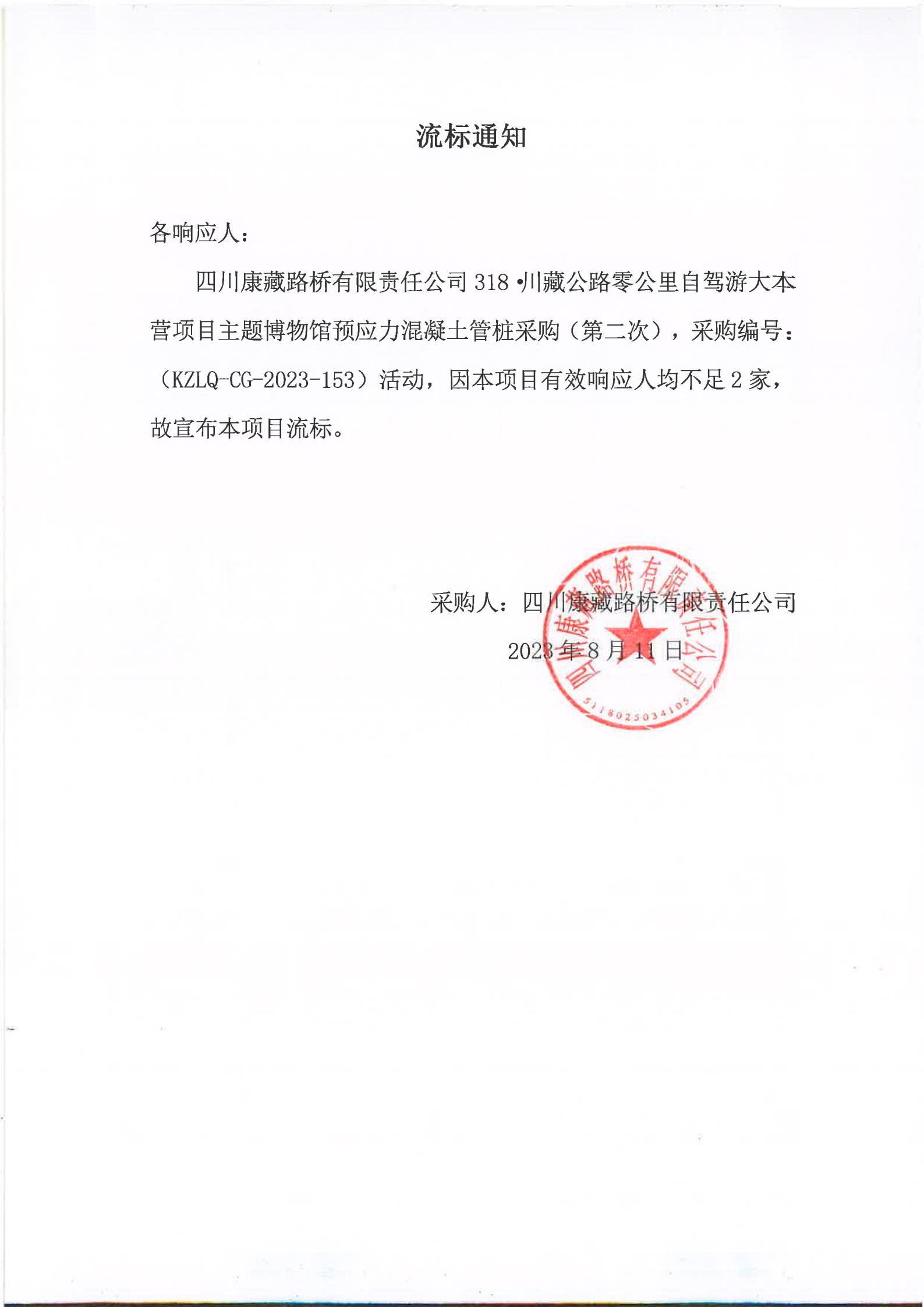 四川康藏路橋有限責(zé)任公司318·川藏公路零公里自駕游大本營(yíng)項(xiàng)目主題博物館預(yù)應(yīng)力混凝土管樁采購(第二次)流標(biāo)通知