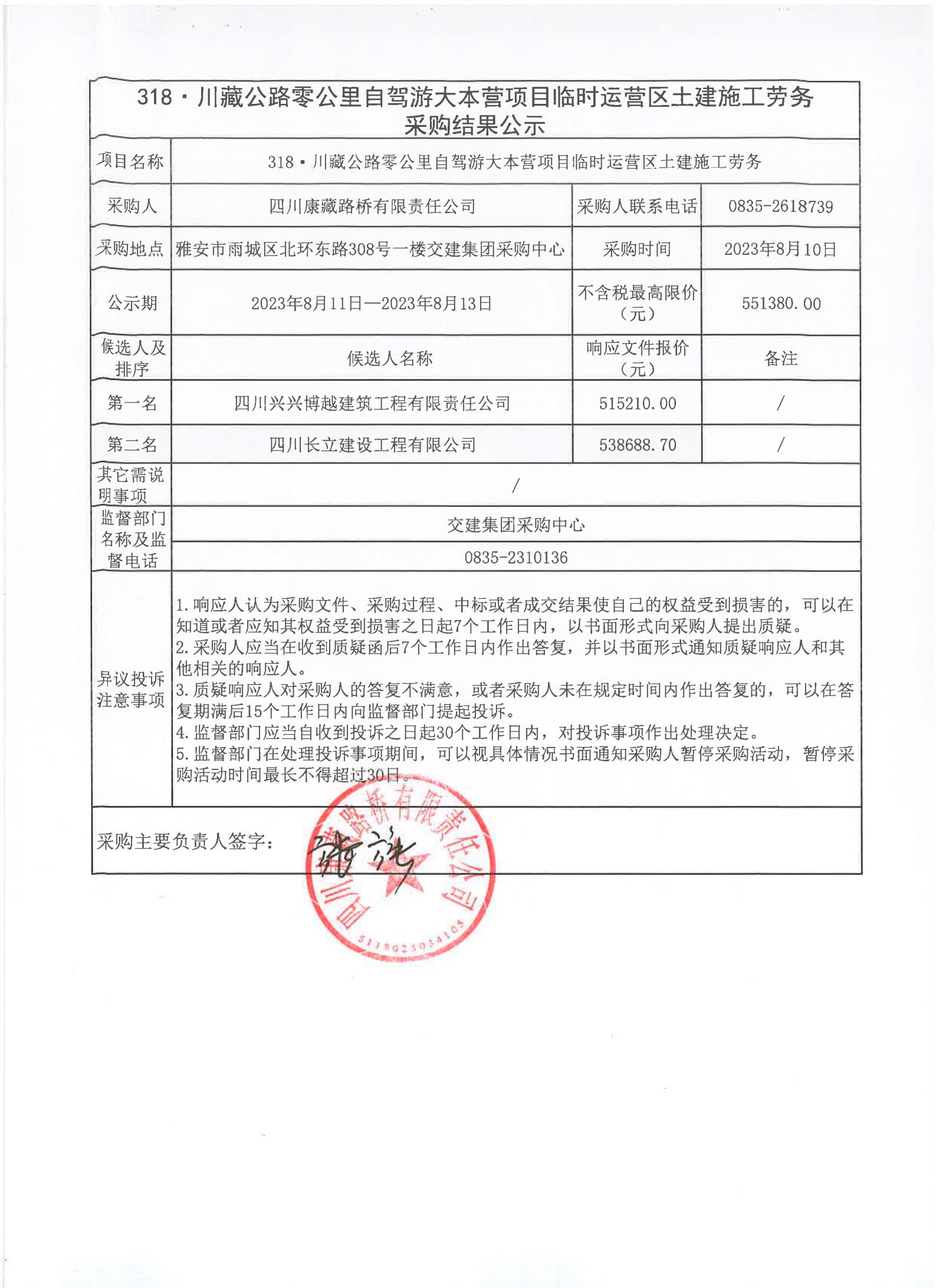 四川康藏路橋有限責任公司318·川藏公路零公里自駕游大本營項目臨時運營區(qū)土建施工勞務(wù)采購結(jié)果公示