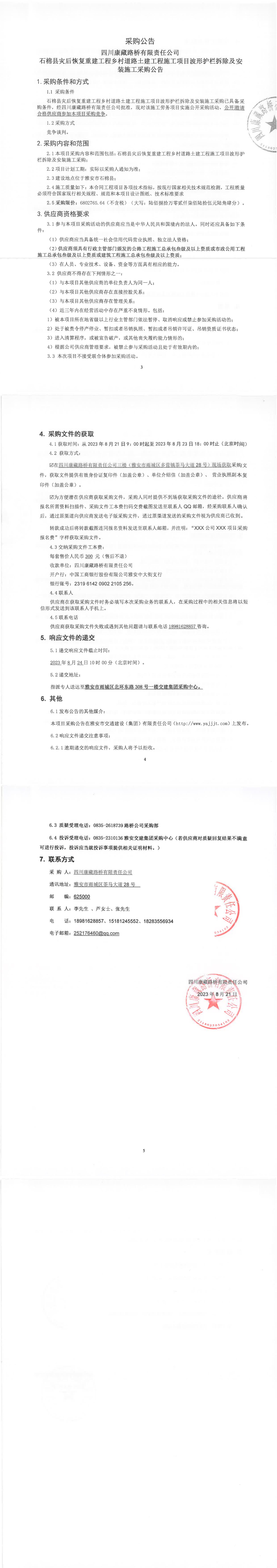 四川康藏路橋有限責任公司石棉縣災(zāi)后恢復(fù)重建工程鄉(xiāng)村道路土建工程施工項目波形護欄拆除及安裝施工采購公告