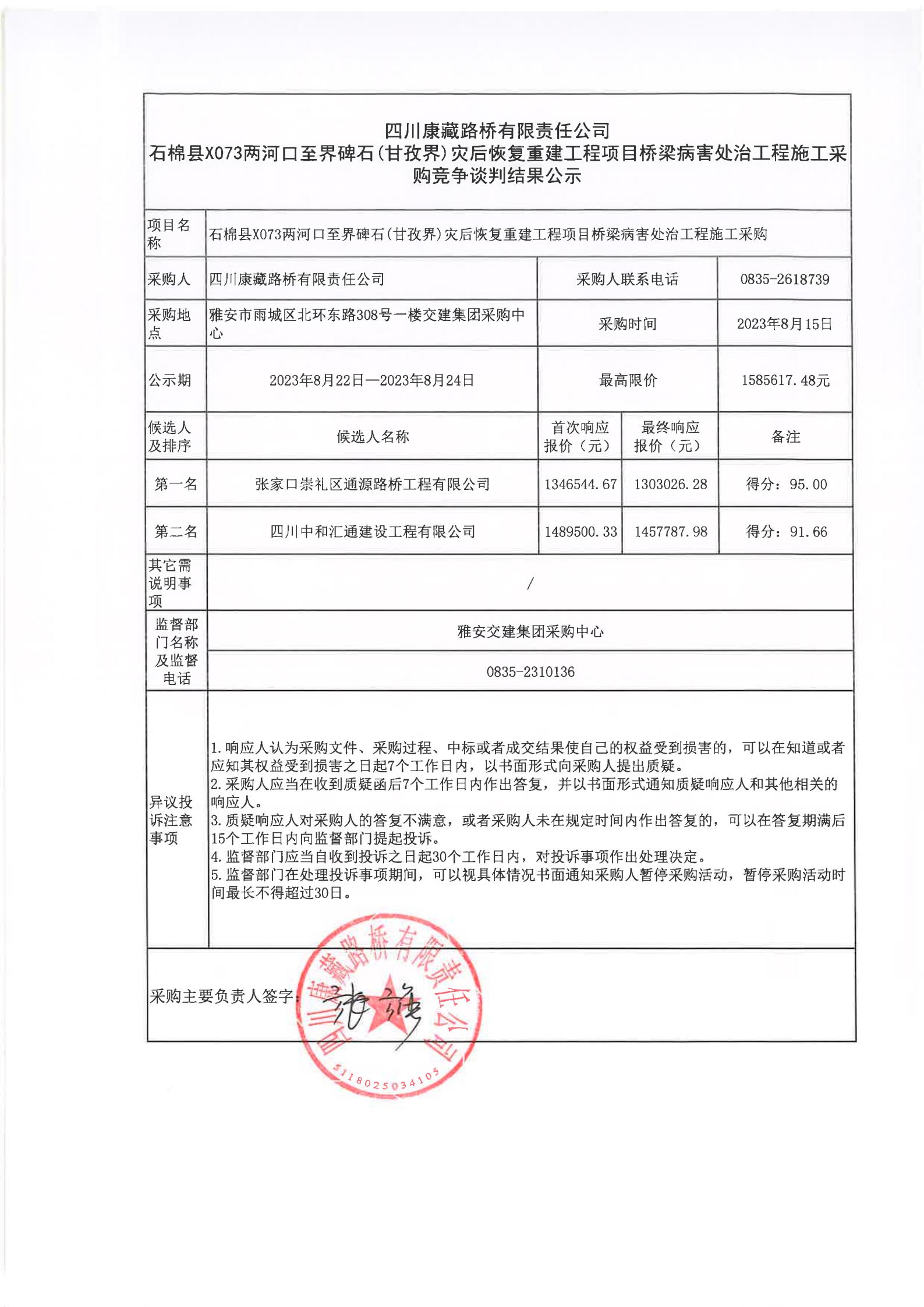 四川康藏路橋有限責(zé)任公司石棉縣X073兩河口至界碑石(甘孜界)災(zāi)后恢復(fù)重建工程項(xiàng)目橋梁病害處治工程施工采購競(jìng)爭(zhēng)談判結(jié)果公示