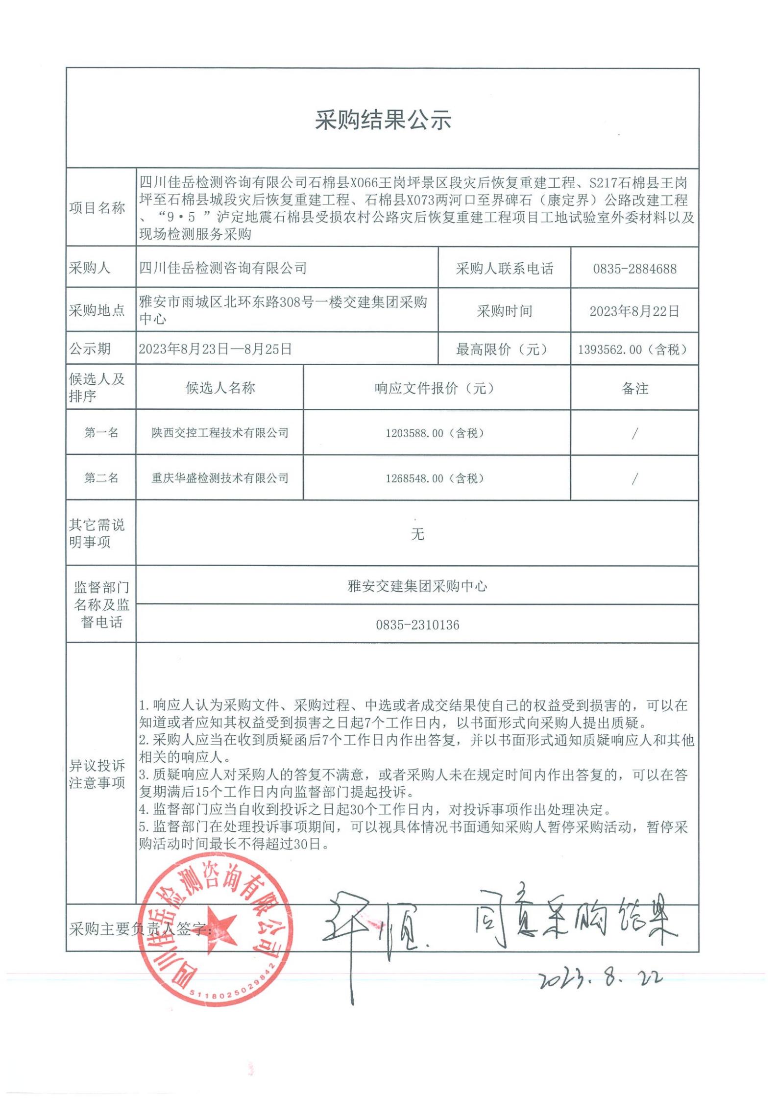 四川佳岳檢測(cè)咨詢有限公司石棉縣X066王崗坪至王崗坪景區(qū)段災(zāi)后恢復(fù)重建工程、S217石棉縣王崗坪至石棉縣城段災(zāi)后恢復(fù)重建工程、石棉縣X073兩河口至界碑石(康定界)公路改建工程、“9·5”瀘定地震石棉縣受損農(nóng)村公路災(zāi)后恢復(fù)重建工程項(xiàng)目外委材料以及現(xiàn)場(chǎng)檢測(cè)試驗(yàn)檢測(cè)服務(wù)采購(gòu)庫(kù)內(nèi)競(jìng)價(jià)結(jié)果公示