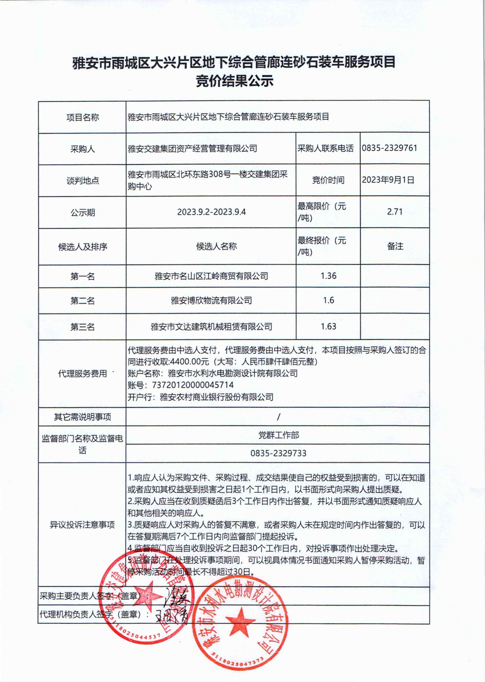 雅安交建集團(tuán)資產(chǎn)經(jīng)營(yíng)管理有限公司大興片區(qū)地下綜合管廊連砂石裝車服務(wù)項(xiàng)目競(jìng)價(jià)結(jié)果公示