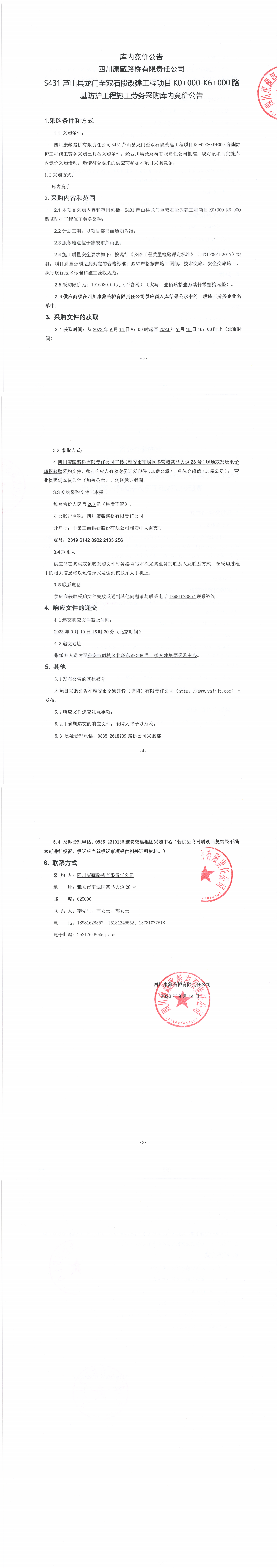 四川康藏路橋有限責(zé)任公司S431蘆山縣龍門至雙石段改建工程項目K0+000-K6+000路基防護工程施工勞務(wù)采購公告