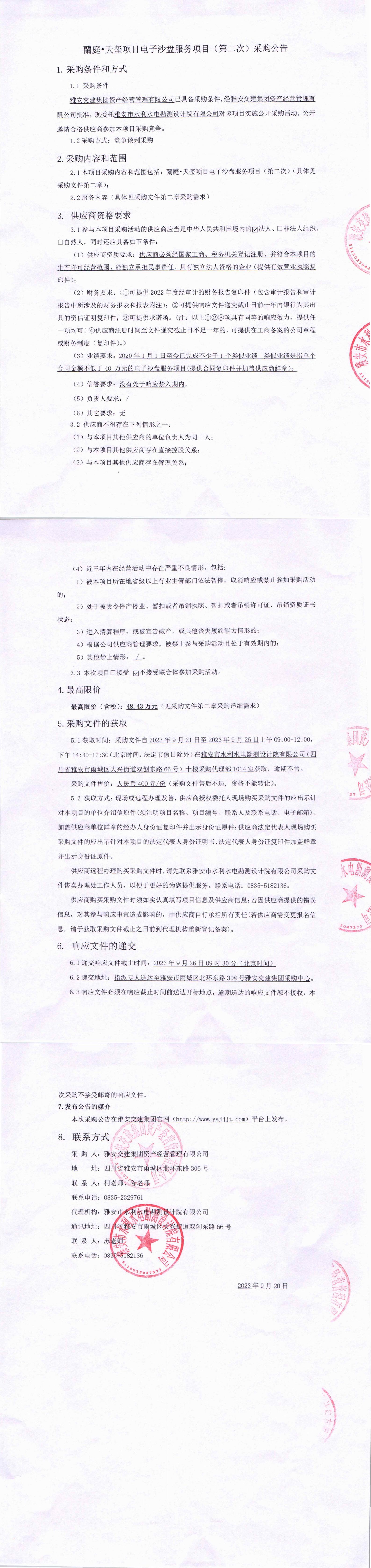 雅安交建集團(tuán)資產(chǎn)經(jīng)營管理有限公司蘭庭·天璽項(xiàng)目電子沙盤服務(wù)項(xiàng)目(第二次)采購公告