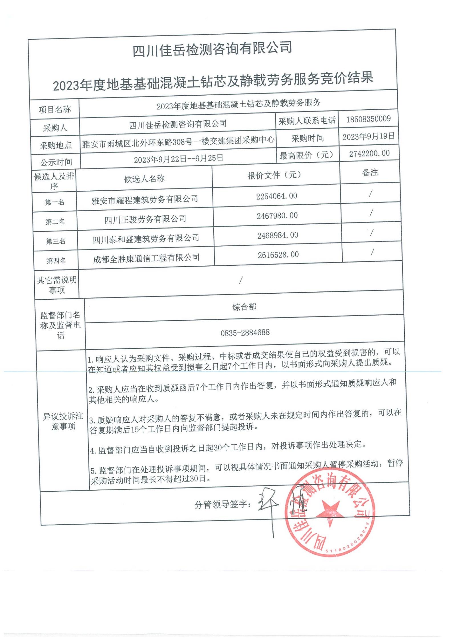 四川佳岳檢測(cè)咨詢有限公司2023年度地基基礎(chǔ)混凝土鉆芯及靜載勞務(wù)庫內(nèi)競(jìng)價(jià)結(jié)果