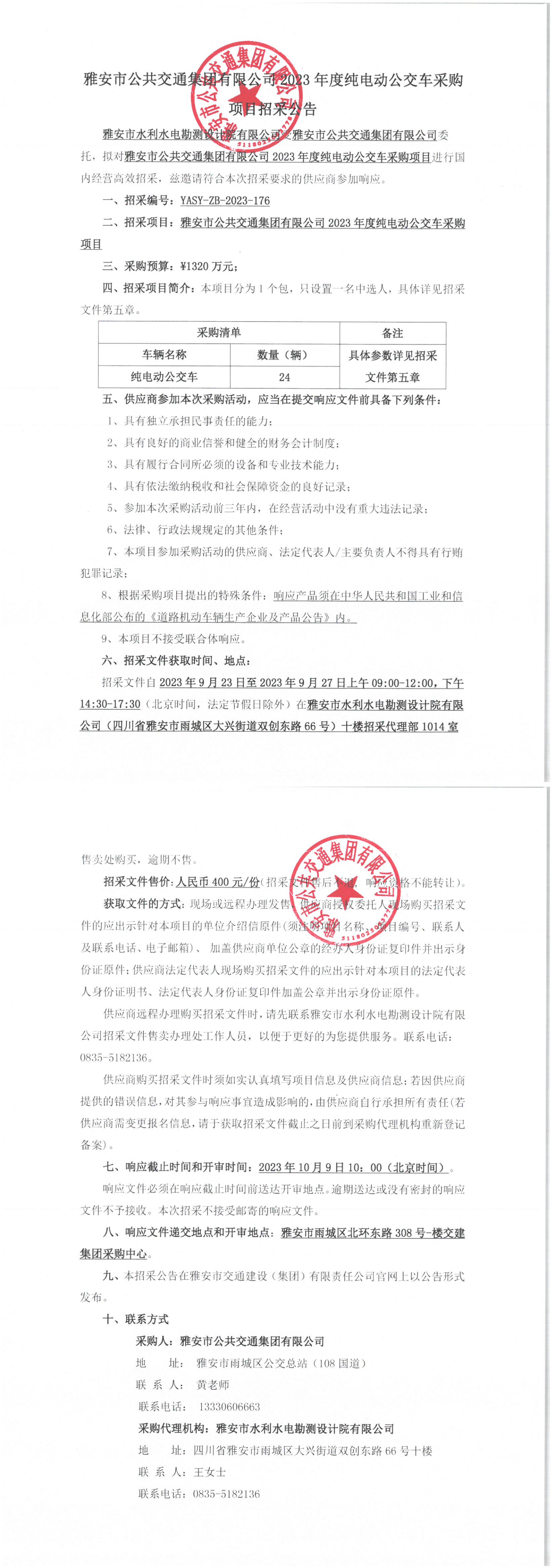 雅安市公共交通集團(tuán)有限公司2023年度純電動車公交車采購項(xiàng)目招采公告