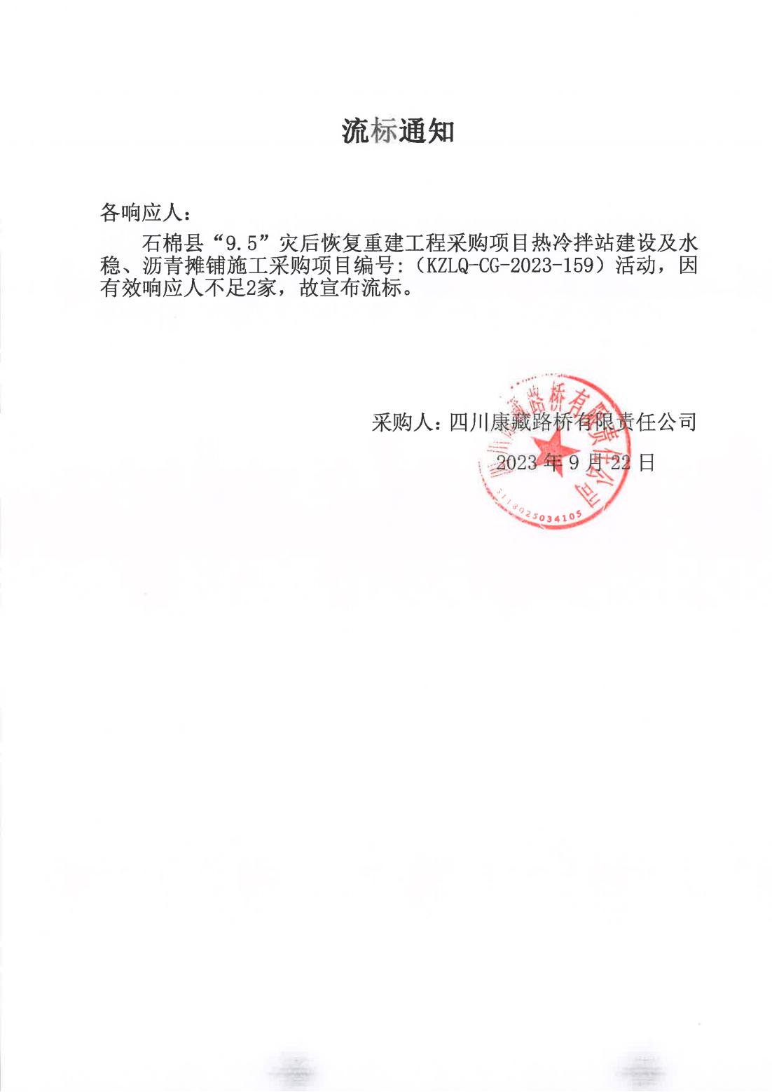 四川康藏路橋有限責任公司石棉縣“9·5”災(zāi)后恢復(fù)重建工程采購項目熱冷拌站建設(shè)及水穩(wěn)、瀝青攤鋪施工采購流標通知
