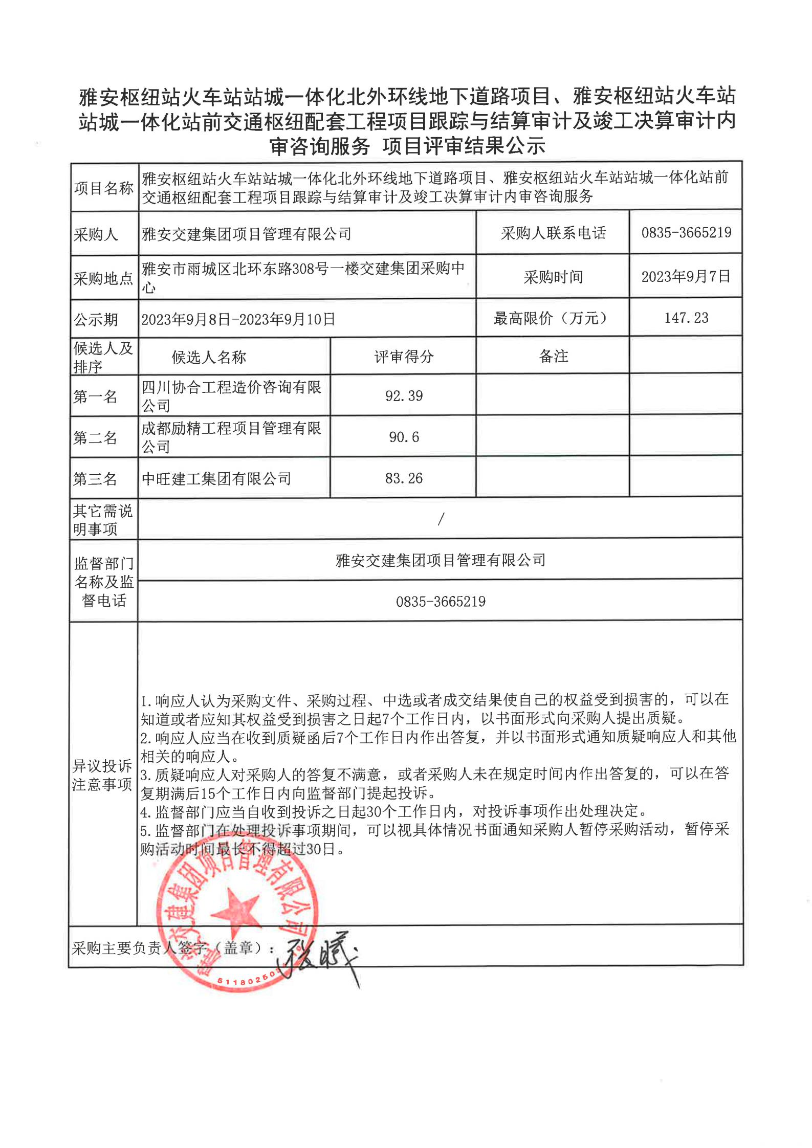 雅安交建集團項目管理有限公司雅安樞紐站火車站站城一體化北外環(huán)線地下道路項目、樞紐站火車站站成一體化站前交通樞紐配套工程項目跟蹤與結(jié)算審計及竣工決算審計內(nèi)審咨詢服務項目評審結(jié)果公示