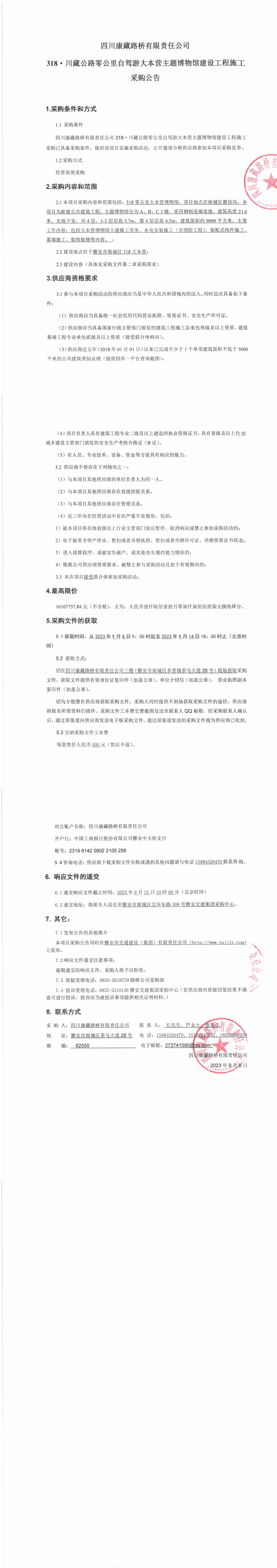 四川康藏路橋有限責(zé)任公司318·川藏公路零公里自駕游大本營(yíng)主題博物館建設(shè)工程施工采購(gòu)公告