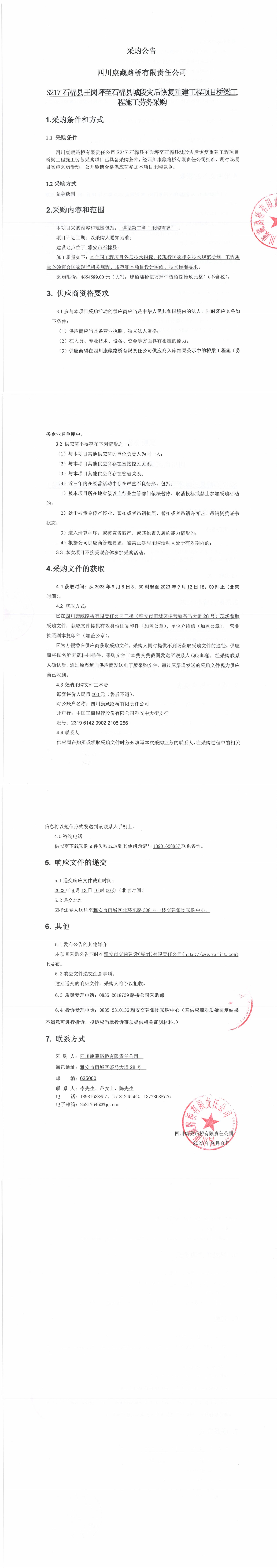 四川康藏路橋有限責(zé)任公司S217石棉縣王崗坪至石棉縣城段災(zāi)后恢復(fù)重建工程項目橋梁工程施工勞務(wù)采購公告
