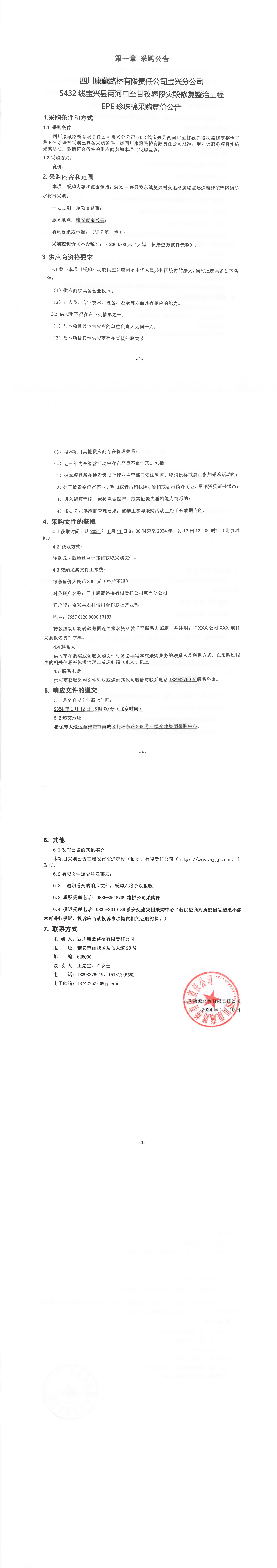 四川康藏路橋有限責任公司寶興分公司S432線寶興縣兩河口至甘孜界段災毀修復整治工程EPE珍珠棉采購競價公告