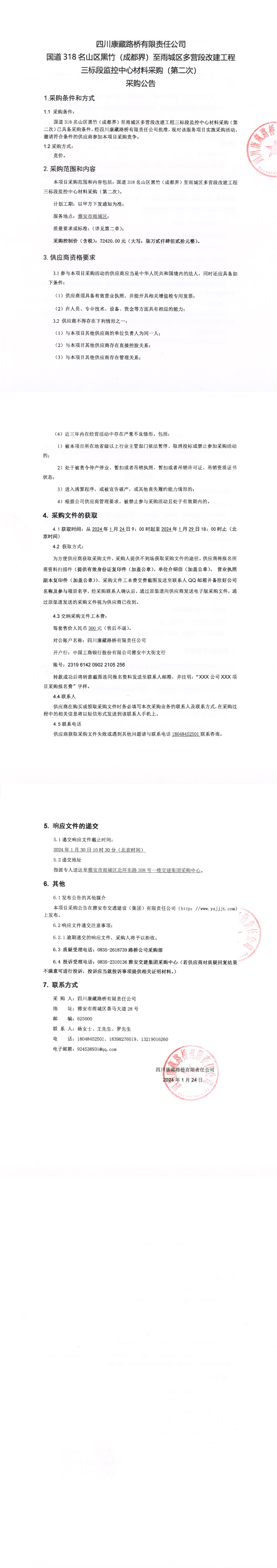 四川康藏路橋有限責(zé)任公司國(guó)道318名山區(qū)黑竹(成都界)至雨城區(qū)多營(yíng)段改建工程三標(biāo)段監(jiān)控中心材料采購(gòu)(第二次)采購(gòu)公告