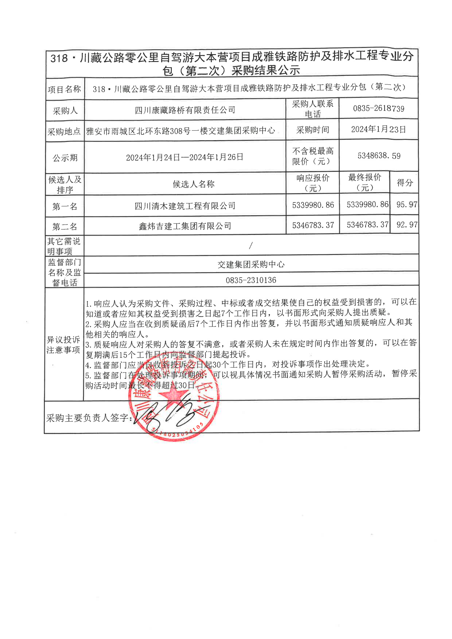 四川康藏路橋有限責任公司318·川藏公路零公里自駕游大本營項目成雅鐵路防護及排水工程專業(yè)分包(第二次)采購結果公示