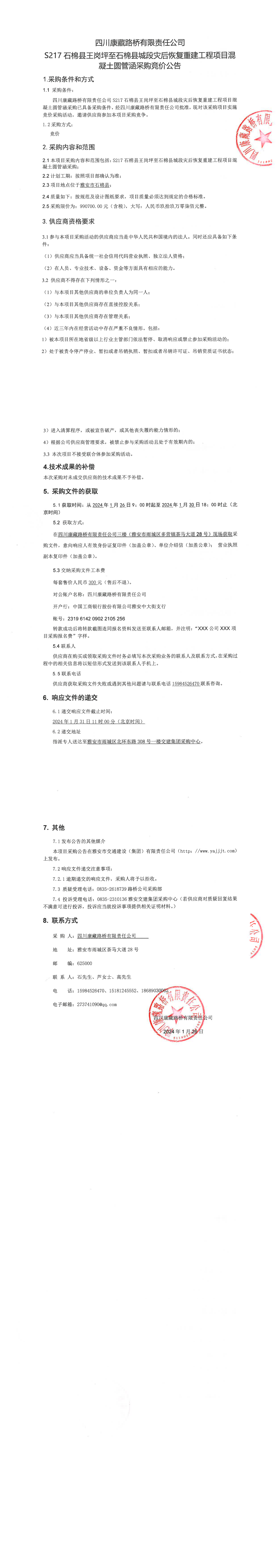 四川康藏路橋有限責(zé)任公司S217石棉縣王崗坪至石棉縣城段災(zāi)后恢復(fù)重建工程項(xiàng)目混凝土圓管涵采購競價(jià)公告