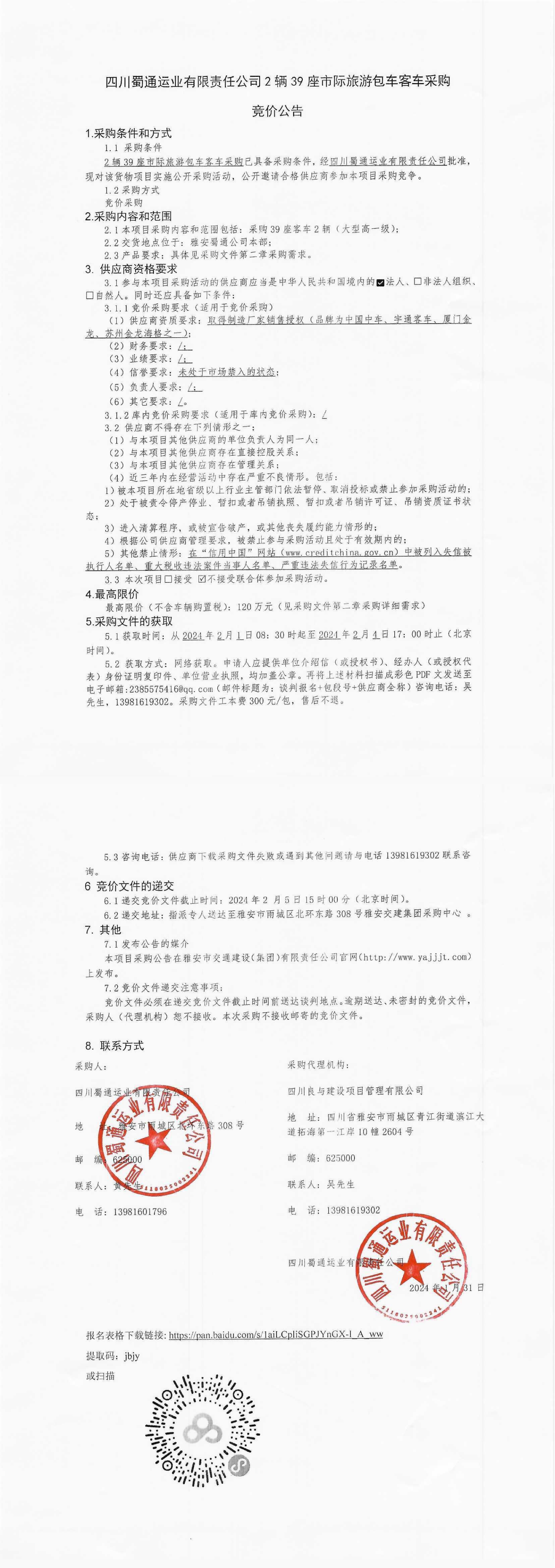 四川蜀通運業(yè)有限責任公司2輛39座市際旅游包車客車采購競價公告