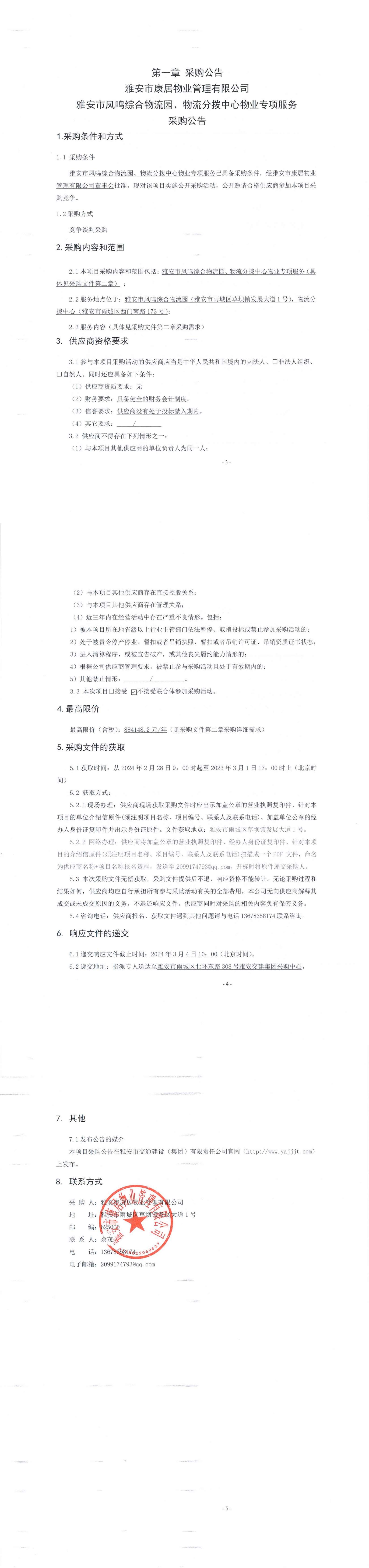 雅安市康居物業(yè)管理有限公司雅安市鳳鳴綜合物流園、物流分撥中心物業(yè)專項(xiàng)服務(wù)采購(gòu)公告