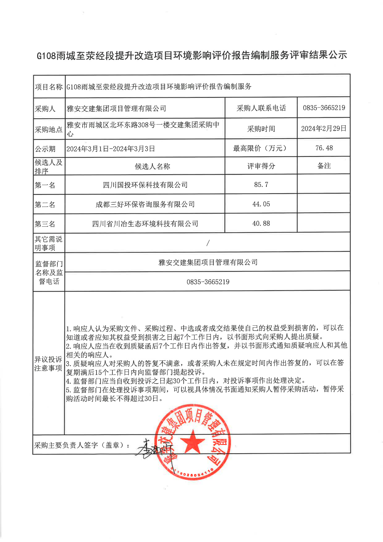 雅安交建集團項目管理有限公司G108雨城至滎經(jīng)段提升改造項目環(huán)境影響評價報告編制服務評審結(jié)果公示