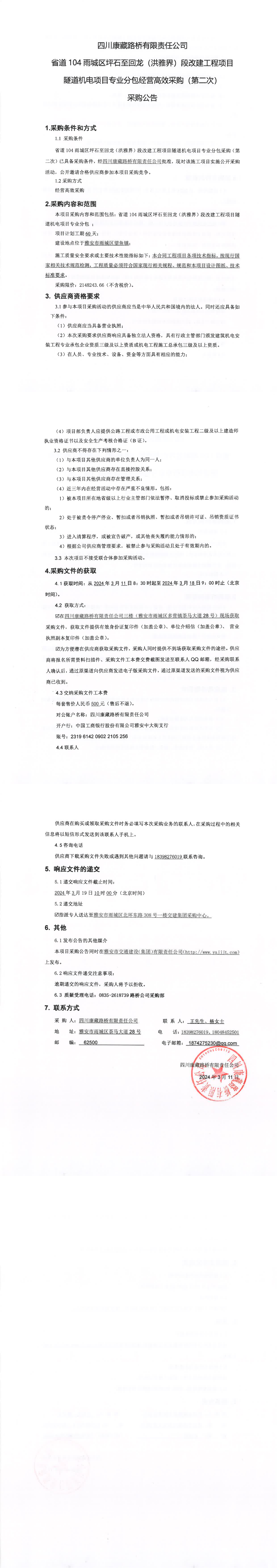 四川康藏路橋有限責(zé)任公司省道104雨城區(qū)坪石至回龍(洪雅界)段改建工程項(xiàng)目隧道機(jī)電項(xiàng)目專業(yè)分包經(jīng)營(yíng)高效采購(gòu)(第二次)采購(gòu)公告