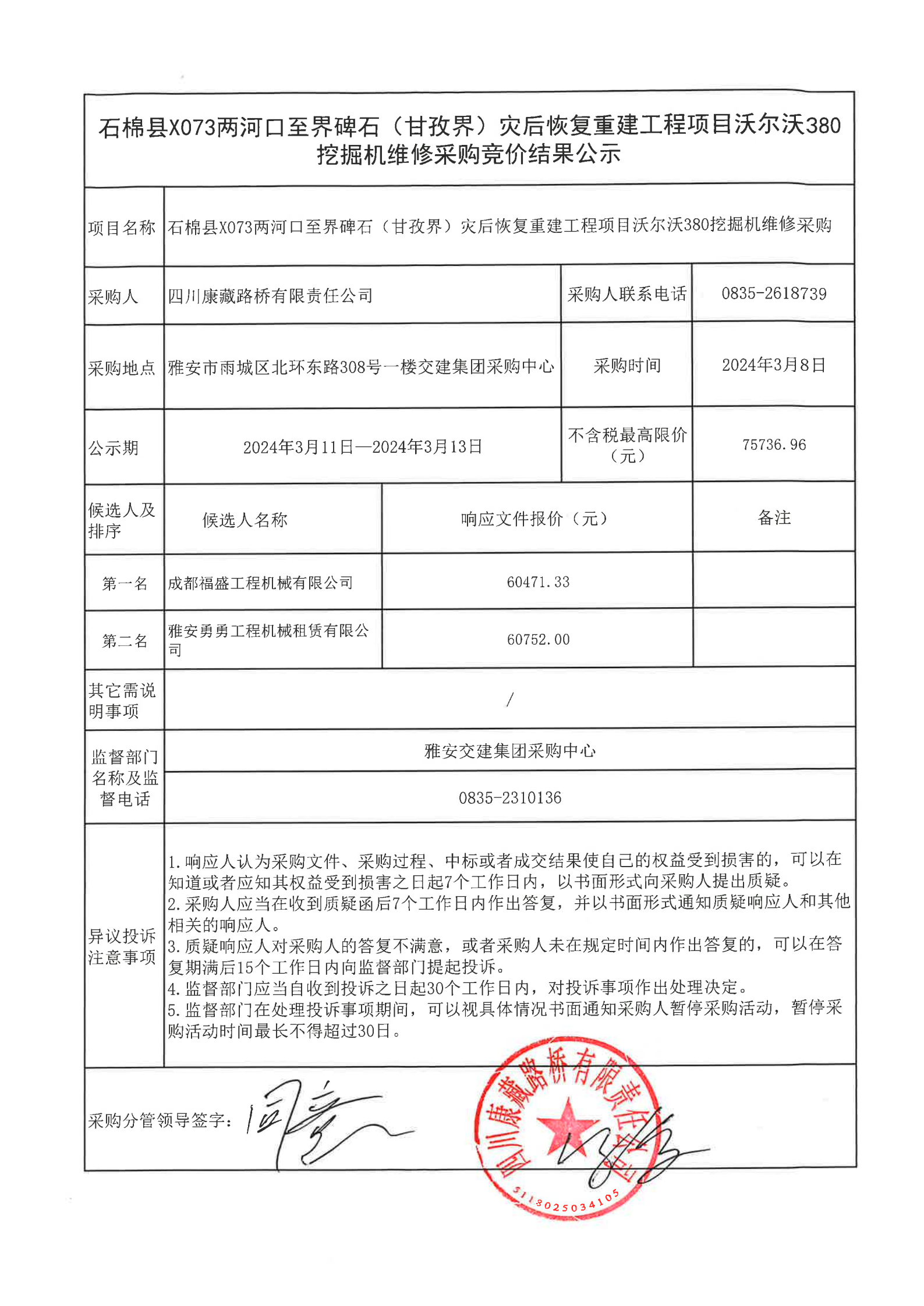 四川康藏路橋有限責(zé)任公司石棉縣X073兩河口至界碑石(甘孜界)災(zāi)后恢復(fù)重建工程項目沃爾沃380挖掘機維修采購競價結(jié)果公示