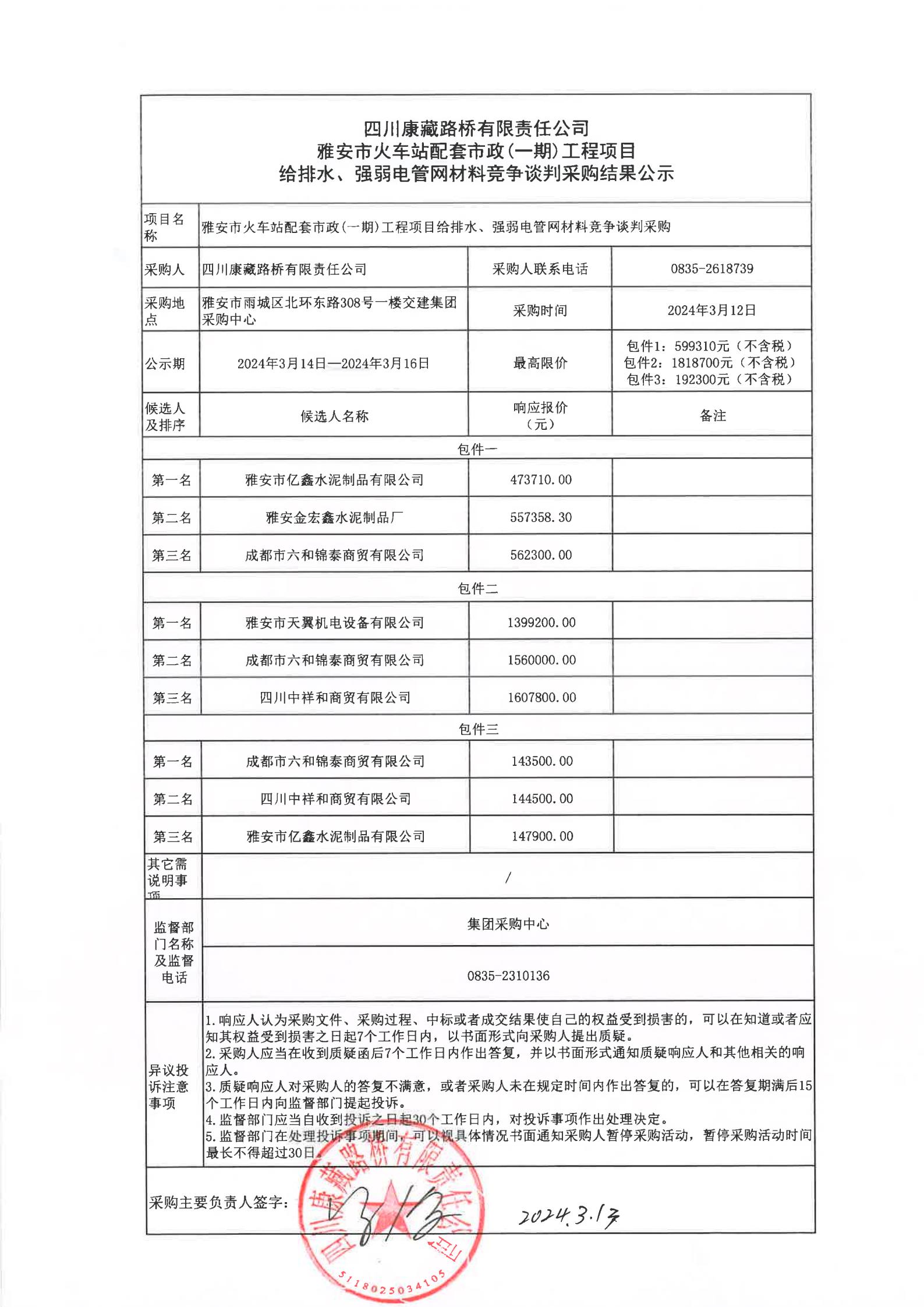 四川康藏路橋有限責(zé)任公司雅安市火車站配套市政(一期)工程項(xiàng)目給排水、強(qiáng)弱電管網(wǎng)材料采購結(jié)果公示