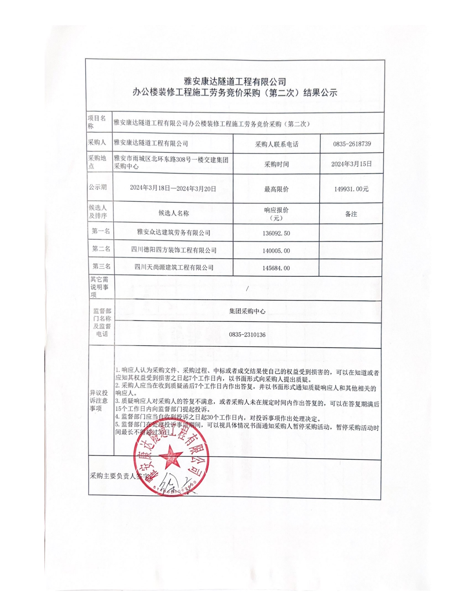 雅安康達隧道工程有限公司辦公樓裝修工程施工勞務(wù)競價采購(第二次)結(jié)果公示