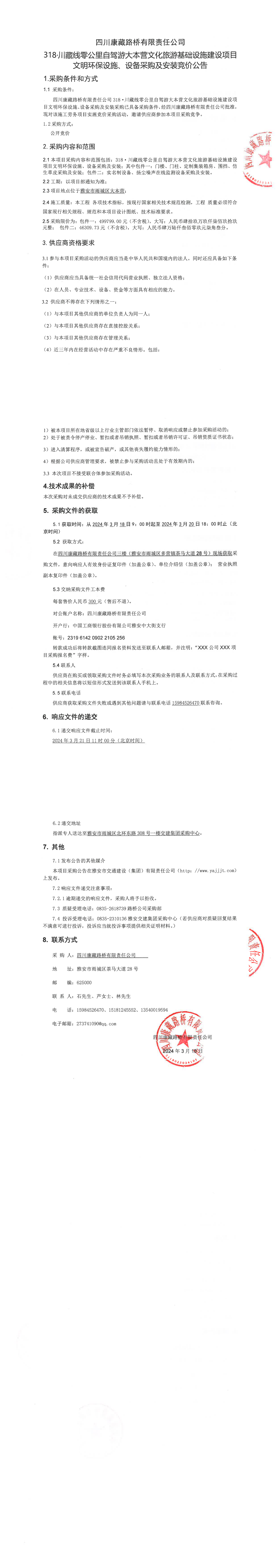 四川康藏路橋有限責(zé)任公司318·川藏公路零公里自駕游大本營(yíng)文化旅游基礎(chǔ)設(shè)施建設(shè)項(xiàng)目文明環(huán)保設(shè)施、設(shè)備采購(gòu)及安裝競(jìng)價(jià)公告