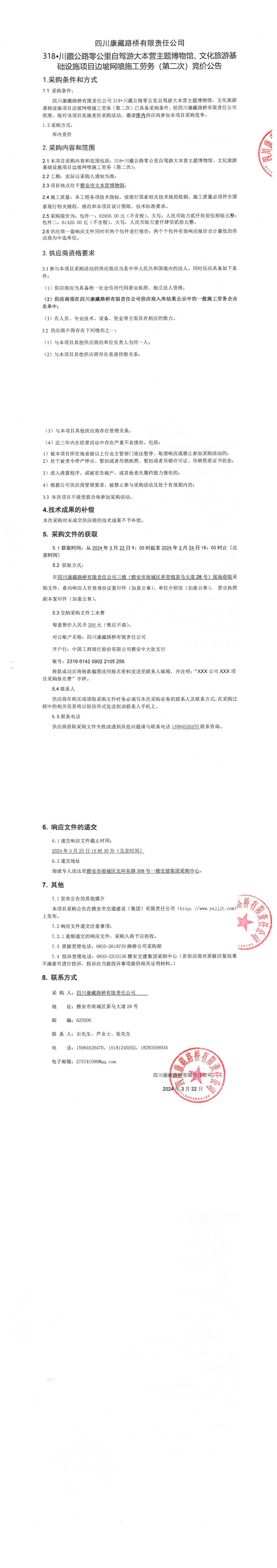 四川康藏路橋有限責(zé)任公司318·川藏公路零公里自駕游大本營(yíng)主題博物館、文化旅游基礎(chǔ)設(shè)施項(xiàng)目邊坡網(wǎng)噴施工勞務(wù)(第二次)競(jìng)價(jià)公告