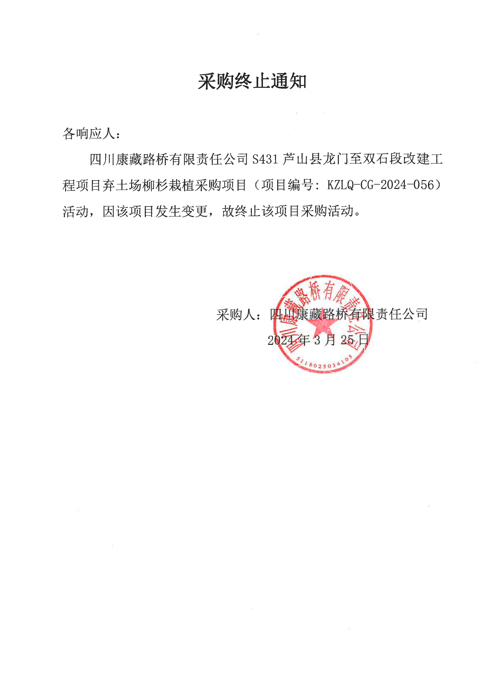 四川康藏路橋有限責(zé)任公司S431蘆山縣龍門鎮(zhèn)至雙石段改建工程項(xiàng)目棄土場(chǎng)柳杉載植采購(gòu)終止通知