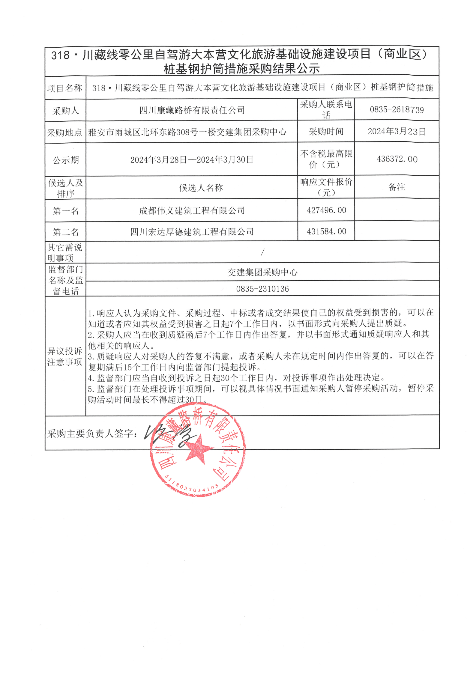 四川康藏路橋有限責(zé)任公司318·川藏公路零公里自駕游大本營文化旅游基礎(chǔ)設(shè)施建設(shè)項目(商業(yè)區(qū))樁基鋼護(hù)筒措施采購結(jié)果公示