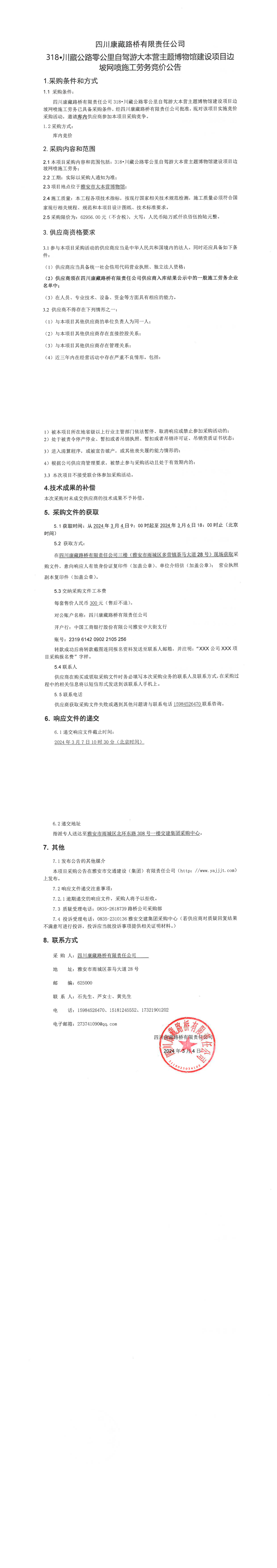 四川康藏路橋有限責(zé)任公司318·川藏公路零公里自駕游大本營主題博物館建設(shè)項(xiàng)目邊坡網(wǎng)噴施工勞務(wù)競價(jià)公告