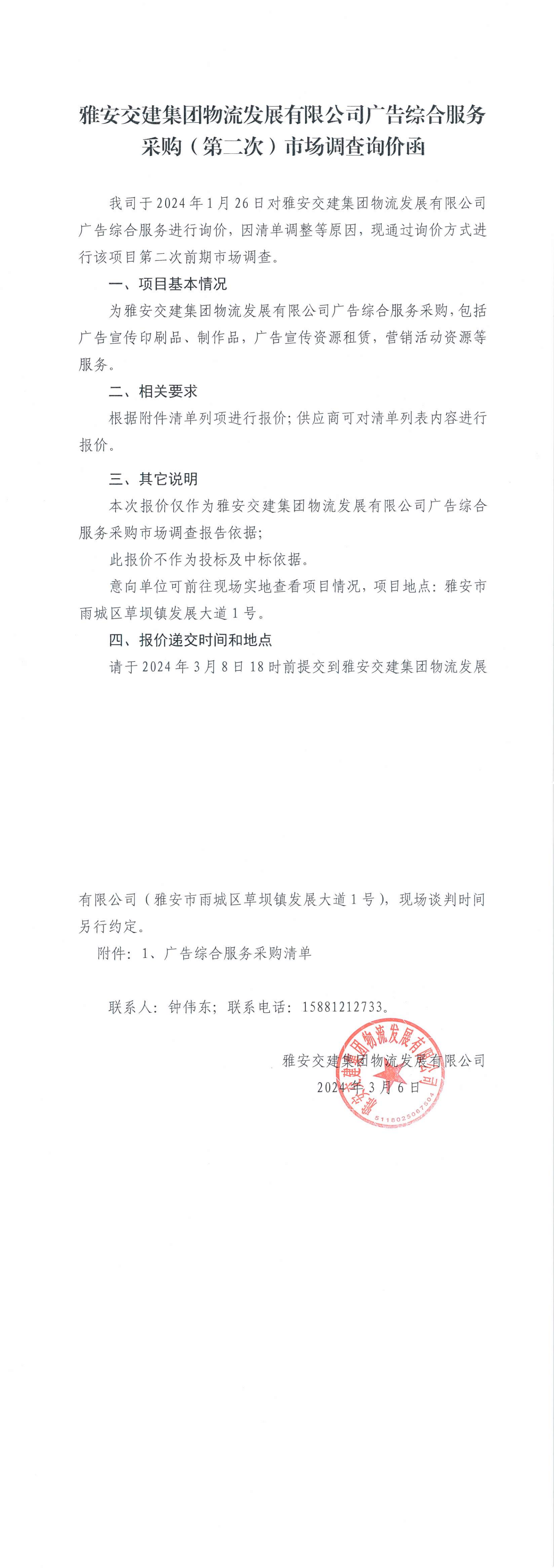 雅安交建集團(tuán)物流發(fā)展有限公司廣告綜合服務(wù)采購(第二次)市場調(diào)查詢價(jià)函