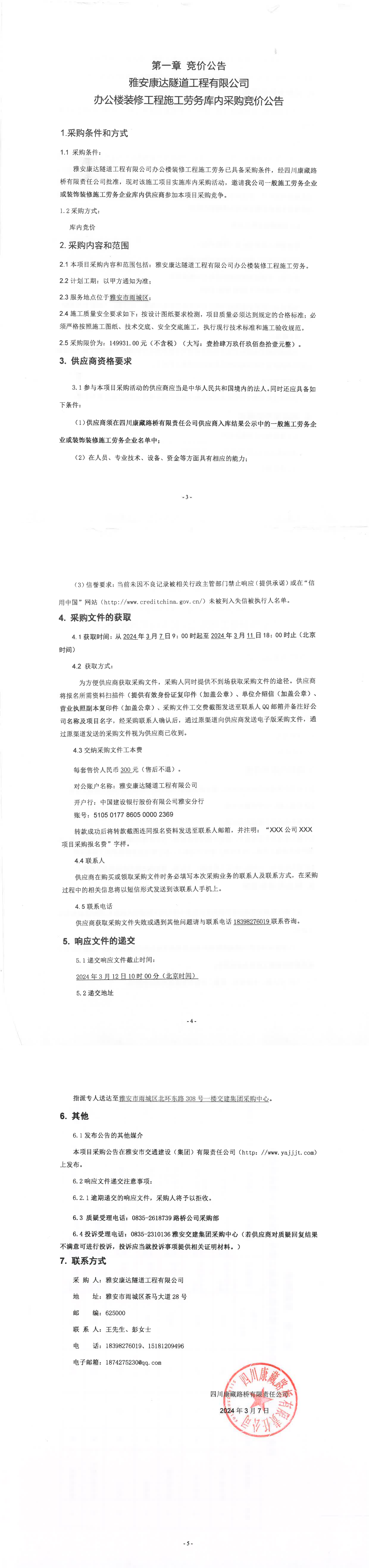 雅安康達(dá)隧道工程有限公司辦公樓裝修工程施工勞務(wù)庫內(nèi)采購競價(jià)公告