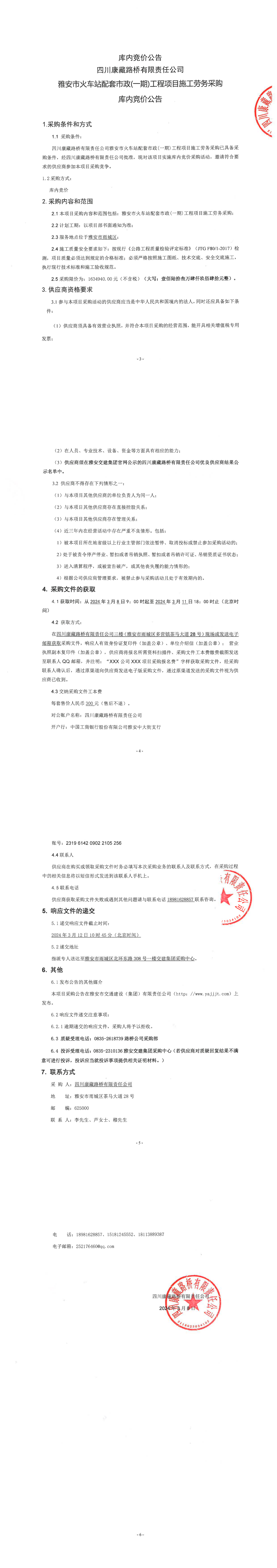 四川康藏路橋有限責(zé)任公司雅安市火車站配套市政(一期)工程項(xiàng)目施工勞務(wù)采購庫內(nèi)競價(jià)公告