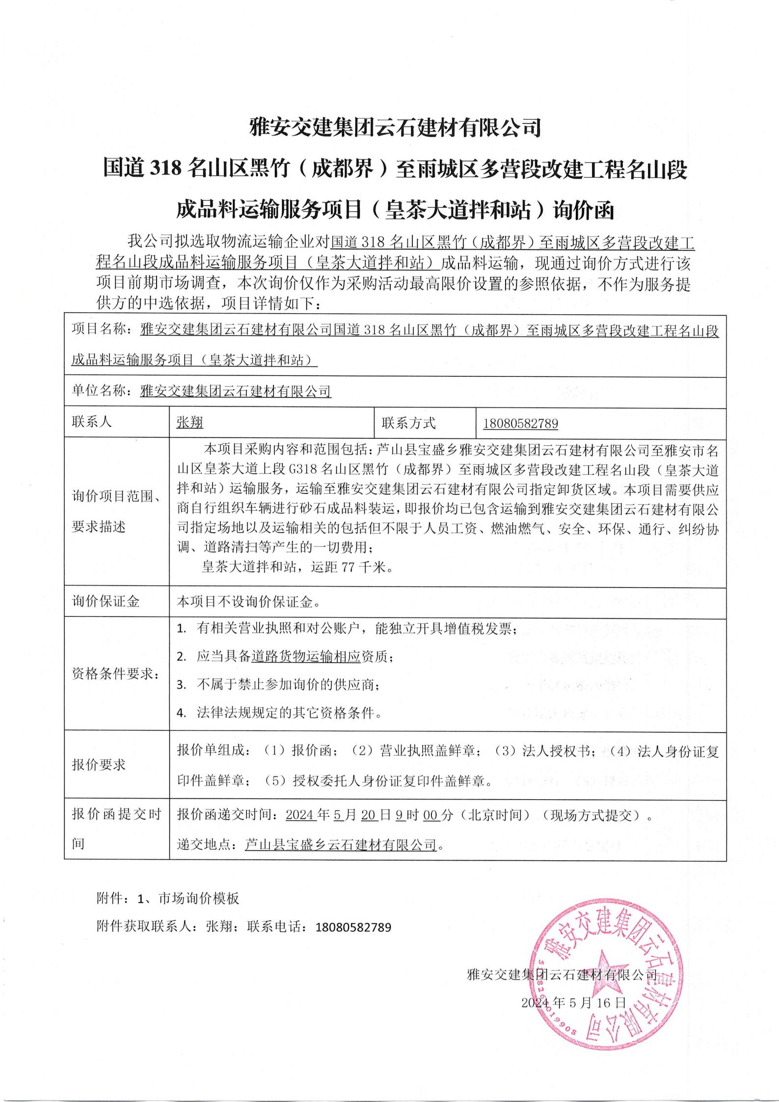 雅安交建集團(tuán)云石建材有限公司S431蘆山縣龍門(mén)至雙石段改建工程成品料運(yùn)輸服務(wù)項(xiàng)目詢(xún)價(jià)函
