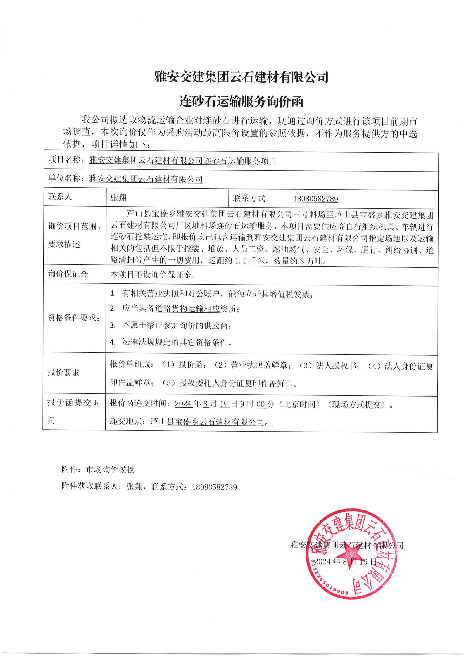 雅安交建集團(tuán)云石建材有限公司連砂石運(yùn)輸服務(wù)詢(xún)價(jià)函