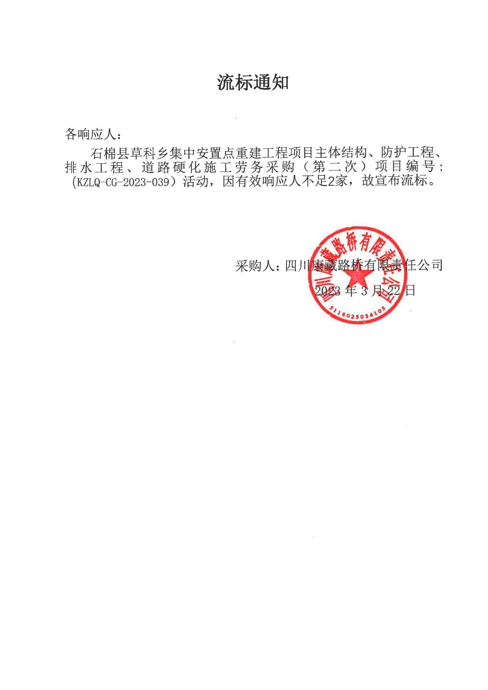 四川康藏路橋有限責(zé)任公司石棉草科鄉(xiāng)集中安置點重建工程項目主體結(jié)構(gòu)、防護工程、排水工程、道路硬化施工勞務(wù)采購流標(biāo)通知(第二次)
