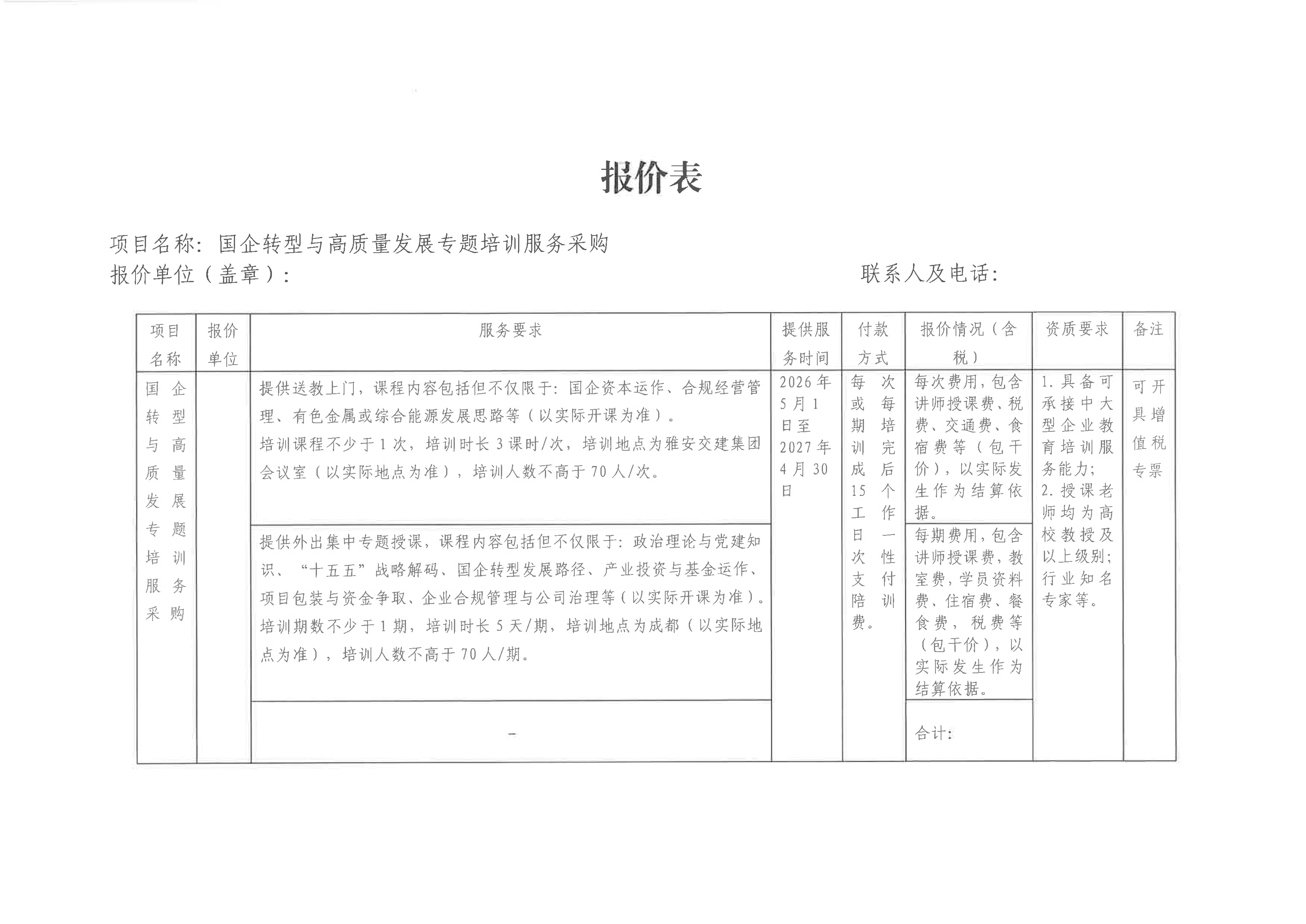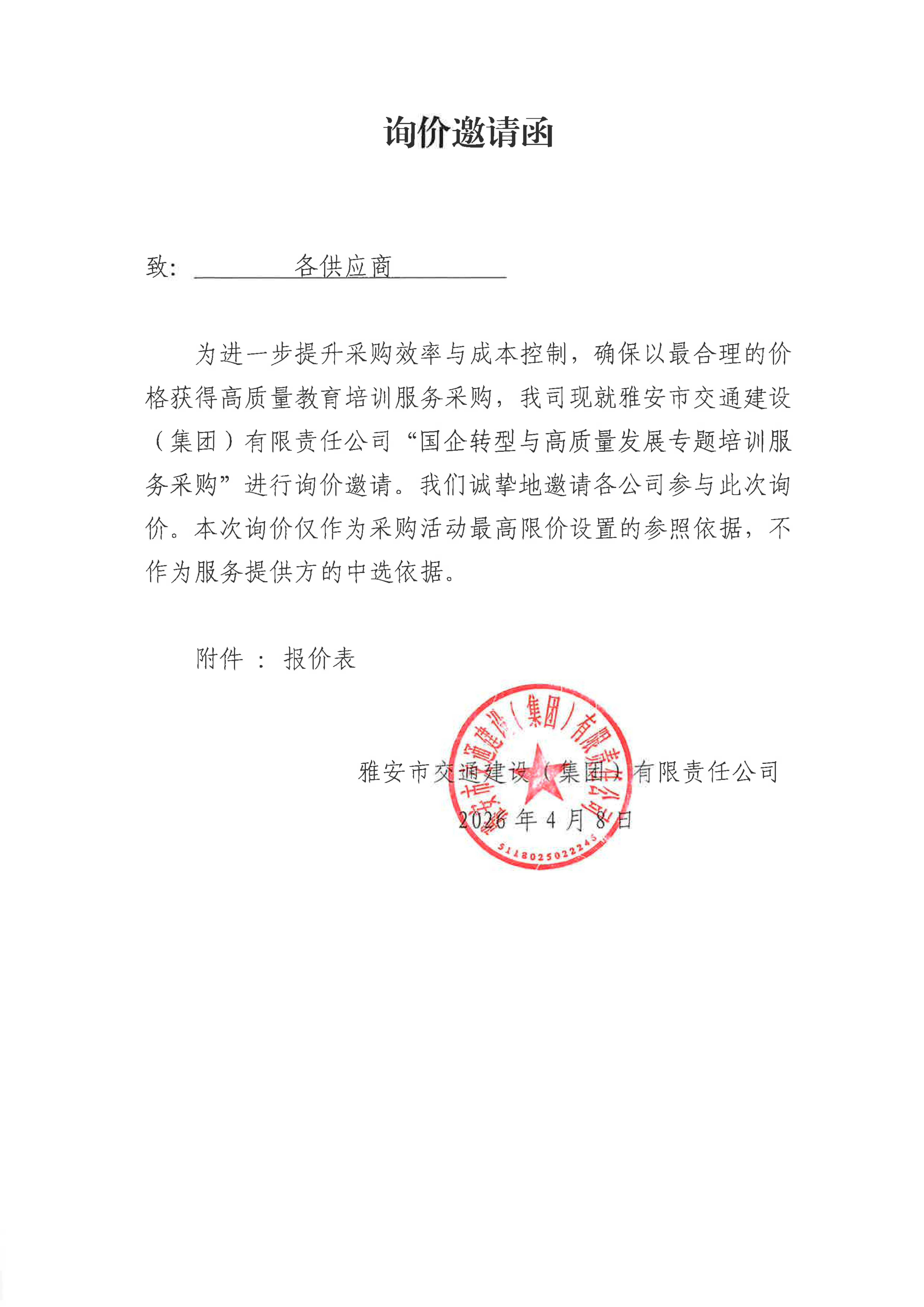 關(guān)于雅安市交通建設(shè)(集團(tuán))有限責(zé)任公司國(guó)企轉(zhuǎn)型與高質(zhì)量發(fā)展專(zhuān)題培訓(xùn)服務(wù)采購(gòu)限價(jià)的詢(xún)價(jià)函