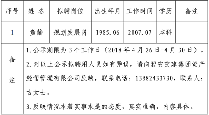 雅安交建集團資產經營管理有限公司擬聘用人員公示