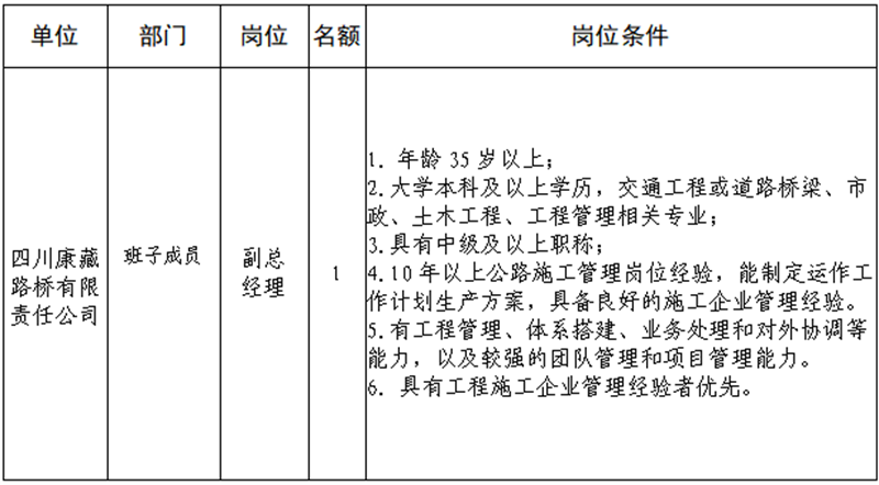 根據(jù)發(fā)展需要,決定面向社會(huì)公開招聘雅安市交通建設(shè)(集團(tuán))有限責(zé)任公司(以下簡稱“雅安交建集團(tuán)”)所屬子公司班子成員4名,現(xiàn)將有關(guān)事項(xiàng)公告如下: