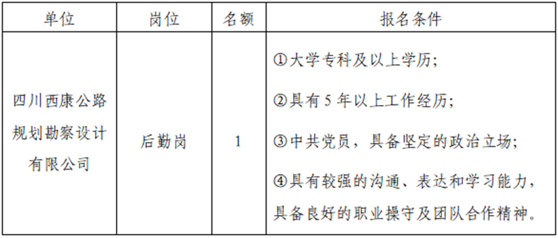 根據(jù)發(fā)展需要,決定面向社會(huì)公開招聘雅安市交通建設(shè)(集團(tuán))有限責(zé)任公司(以下簡(jiǎn)稱“雅安交建集團(tuán)”)所屬子公司綜合辦公室后勤崗1名,現(xiàn)將有關(guān)事項(xiàng)公告如下: