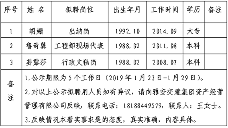 通過公開報名、資格審查、筆試、面試等程序,經(jīng)雅安交建集團資產(chǎn)經(jīng)營管理有限公司研究,對以下