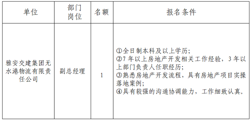 根據(jù)發(fā)展需要,現(xiàn)面向社會公開招聘雅安市交通建設(集團)有限責任公司(以下簡稱“雅安交建集團”)所屬子公司經(jīng)營班子人員1名,現(xiàn)將有關事項公告如下: