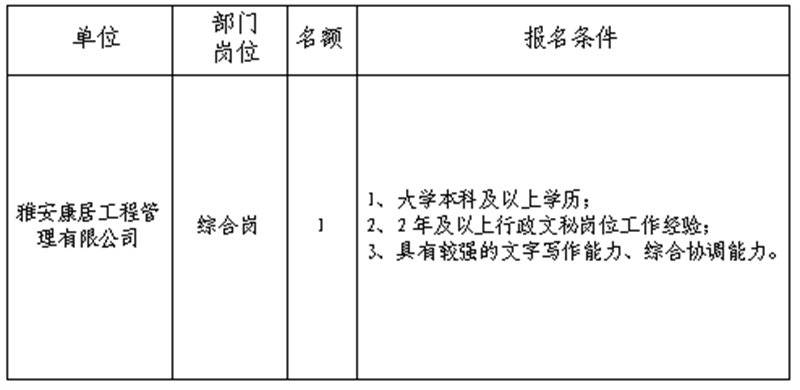 根據(jù)發(fā)展需要,決定面向社會(huì)公開招聘雅安市交通建設(shè)(集團(tuán))有限責(zé)任公司(以下簡稱“雅安交建集團(tuán)”)所屬子公司工作人員1名,現(xiàn)將有關(guān)事項(xiàng)公告如下: