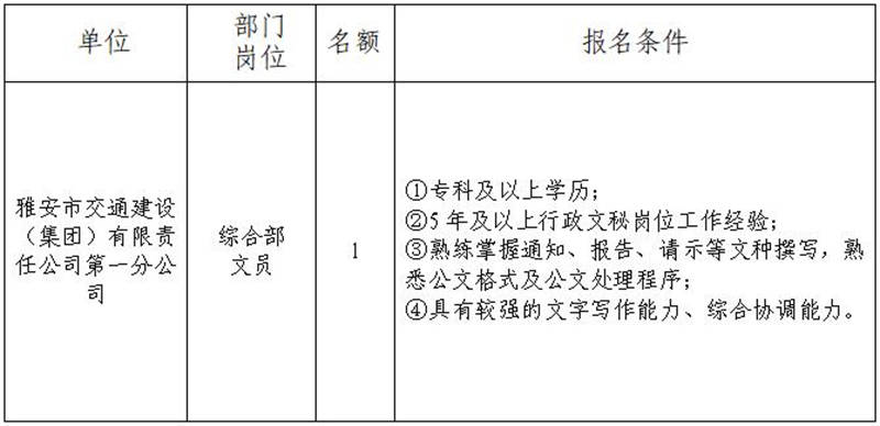 根據(jù)發(fā)展需要,決定面向社會公開招聘雅安市交通建設(集團)有限責任公司(以下簡稱“雅安交建集團”)所屬分公司工作人員1名,現(xiàn)將有關事項公告如下: