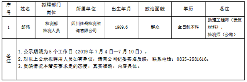 雅安交建集團子公司擬聘用人員公示(路橋公司)