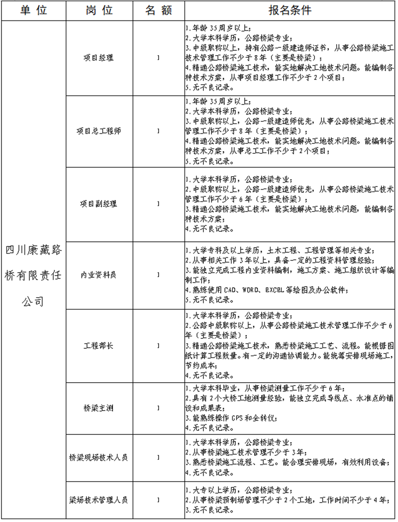 根據(jù)公司業(yè)務(wù)發(fā)展需要,決定面向社會(huì)公開招聘省道104線草壩至姚橋段改建項(xiàng)目部專業(yè)技術(shù)人才8名,現(xiàn)將有關(guān)事項(xiàng)公告如下: