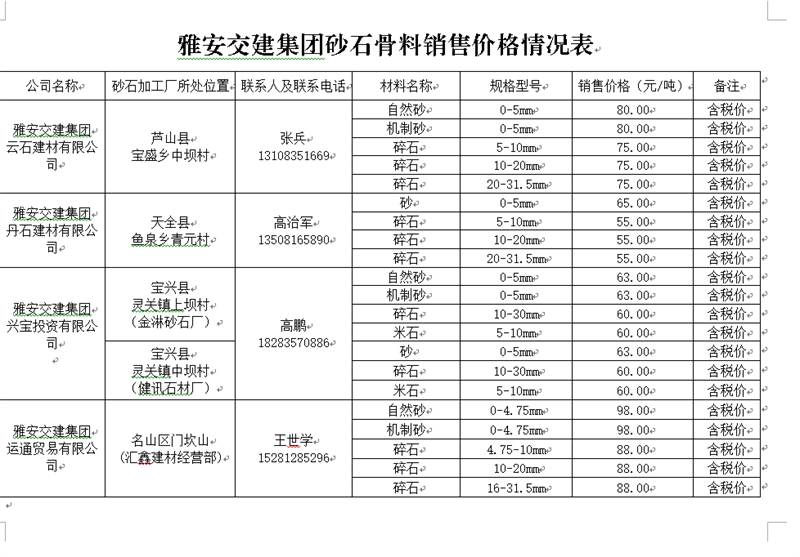 四、運(yùn)通貿(mào)易有限公司。運(yùn)通公司是雅安市交通建設(shè)(集團(tuán))有限責(zé)任公司獨(dú)資子公司,主要負(fù)責(zé)雨城區(qū)中心城區(qū)河道外砂石經(jīng)營(yíng)管理工作。目前,公司與兩家企業(yè)確定了代加工合作關(guān)系:一是名山區(qū)匯鑫建材經(jīng)營(yíng)部,該企業(yè)位于名山區(qū)門坎山,已投產(chǎn);二是雅安市名山區(qū)雙飛化工商貿(mào)有限公司該公司位于名山區(qū)馬鞍山,已具備生產(chǎn)加工能力;預(yù)計(jì)年生產(chǎn)能力約80萬(wàn)噸。