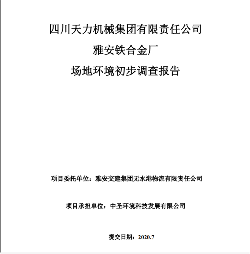四川天力機械集團有限責(zé)任公司——雅安鐵合金廠場地環(huán)境初步調(diào)查報告